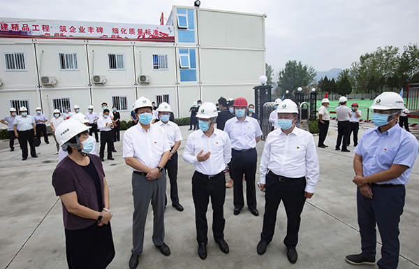6月29日,怀柔区区委书记、怀柔科学城党工委书记戴彬彬,区委副书记、区长、怀柔科学城党工委副书记于庆丰及区人大、区政协、区委政法委、区纪委等主要领导一行莅临我集团公司承建的雁栖国际社区项目视察指导。北京怀柔科学城管委会副主任任建民、丁明志,北京怀柔科学城管委会开发建设处处长史忠峰,北京市长城伟业投资开发总公司党委书记、董事长单景民,党委副书记、总经理周志斌,项目监理方、设计方领导,集团公司党委书记、董事长陈先瑞及项目相关负责人等迎接陪同。